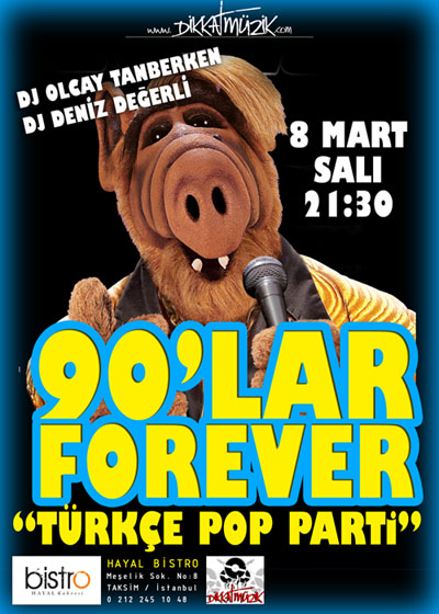 DikkatMüzik!‘in tanıtım sponsorluğunda bu ay Hayal Bistro‘da 2 konsept parti düzenleniyor. İlk olarak 8 Mart‘ta “90’LAR FOREVER, TÜRKÇE POP PARTİSİ”nin düzenleneceği gecede 90’lı yıllardan hafızalara kazınan unutulmayan Türkçe pop şarkılar dinleyici ile buluşacak. 22 Mart‘ta ise bu kez “TÜRKÇE-YUNANCA HITS PARTY!” Bistro sahnesinde sizlerle. Her 2 partiye de giriş ücretsiz.