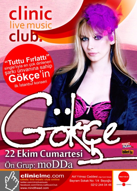 Yalnızca 2011 yazının değil, yılın da en çok dinlenen ve çalınan şarkılarından olan “Tuttu Fırlattı” teklisiyle büyük bir çıkış gerçekleştiren Gökçe, teklinin ardından ilk sahnesi ile İstanbullu müzikseverlere sesleniyor. Genç şarkıcı 22 Ekim Cumartesi gecesi Clinic Live Music Club’da sahne alacak.
