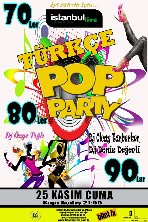 70’li yılların 45’lik plaklarından, 80’lerin Türk hafif müziğine ve 90’ların Türkçe pop müziğine kadar uzanan geniş bir yelpazede dans edip eğlenebileceğiniz “70’ler/80’ler/90’lar Türkçe Pop Parti”nin ikincisi; 25 Kasım 2011, Cuma akşamı Istanbul Live’da!