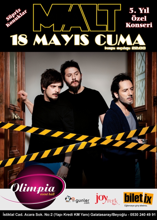 Malt grubu, kuruluşunun 5. yılı nedeniyle özel bir konserle 18 Mayıs Cuma gecesi Beyoğlu Olimpia Event Hall’de sahne alıyor. Sürpriz konukların da katılacağı açıklanan gecenin biletleri Biletix’te: http://www.biletix.com/etkinlik/NKZ36/TURKIYE/tr