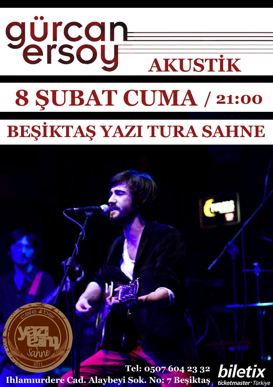 Bu yazımı okuyup aranızda Gürcan Ersoy’u merak eden ve dinlemek isteyenler varsa; en yakın konser bu hafta cuma günü (08.02.2013) Beşiktaş’ta “Yazı Tura Sahne” de akustik performansı ile dinleyicisinin karşısında olacak. (Ben ve arkadaşlarımda orada olacağız. Bence kaçırmayın…) Ayrıca Biletix’te yayınlanan habere göre; Redd ve Gürcan Ersoy aynı sahneyi 21 Şubat ve 1 Mart arasında Çanakkale, Edirne, Isparta ve Antalya’da paylaşacaklarmış. (Bu iki grubu aynı sahnede izleyecek olanlar bence kendilerini sürprizlere açık tutsunlar. :) )  21 Şubat’ta Çanakkale’de, 22 Şubat’ta Edirne’de, 28 Şubat’ta Isparta’da ve 01 Mart’ta Antalya’da olacaklar bilginize… ;)