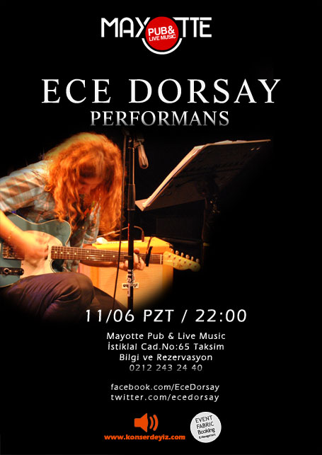 Efes One Love Fest 2011, H2000, Hayal Kahvesi, Bronx, Boğaziçi Üniversitesi gibi bir çok yerde ve festivalde sahne alan Ece Dorsay 16 Mayıs’taki solo sahne projesinde Telecaster elektro gitarı ve pedallarıyla, memleketten pop ve dünyadan caz şarkılarını kendine özgü alternatif yorumuyla çalıp söyleyecek.