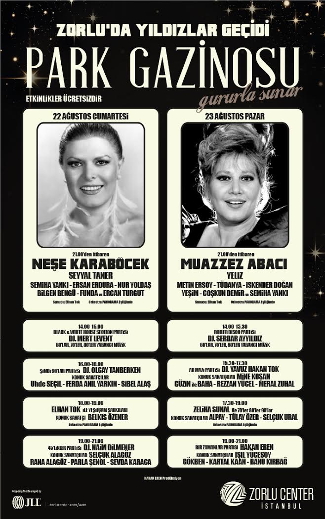 22 Ağustos Cumartesi akşamı saat 21:00’den itibaren Neşe Karaböcek, Seyyal Taner, Semiha Yankı, Ersan Erdura, Nur Yoldaş, Bilgen Bengü, Funda ve Ercan Turgut’un sahne alacağı gecenin öncesinde geçmişin en güzel yabancı şarkılarıyla saat 14:00’de Dj Mert Levent, saat 16:00’da 90’lar partisi ile Dj.Olcay Tanberken ve konukları Uhde Seçil, Sibel Alaş ve Ferda Anıl Yarkın kısa performanslar sergileyecek. Zorlu Park Gazinosu’nda Yeşilçam’ın efsane yıldızlarına, hatıralarda yer etmiş unutulmaz filmlerin unutulmaz şarkılarına adeta bir saygı duruşu yapılacak. Elhan Tok ve konuğu Belkıs Özener’in canlı performansları ile Yeşilçam şarkıları saat 18:00’de izleyiciler ile buluşacak; saat 19:00’da ise Dj.Naim Dilmener ile unutulmaz 45’likler ve o şarkılara hayat veren Selçuk Alagöz, Rana Alagöz, Parla Şenol ve Sevda Karaca kısa performanslarıyla izleyicilere unutulmaz anlar yaşatacaklar.